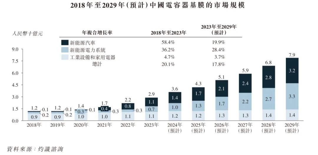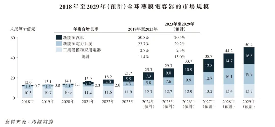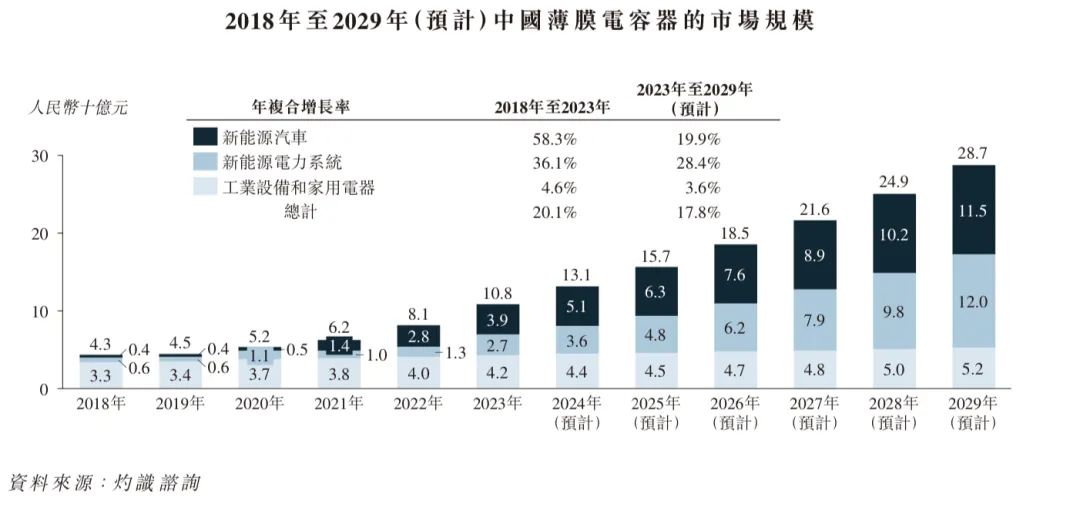 随着中国新能源汽车市场的迅速发展,充电站及电动驱动系统对薄膜电容器的需求正不断上升。在新能源电力系统方面,中国大力推动太阳能、风能及储能,增加了对电力转换设备的需求,刺激了对薄膜电容器的需求。中国薄膜电容器市场的规模由2018 年的人民币43 亿元增至2023 年的人民币108 亿元,年复合增长率为20.1%,预计到2029 年将达到人民币287 亿元,年复合增长率为17.8%。