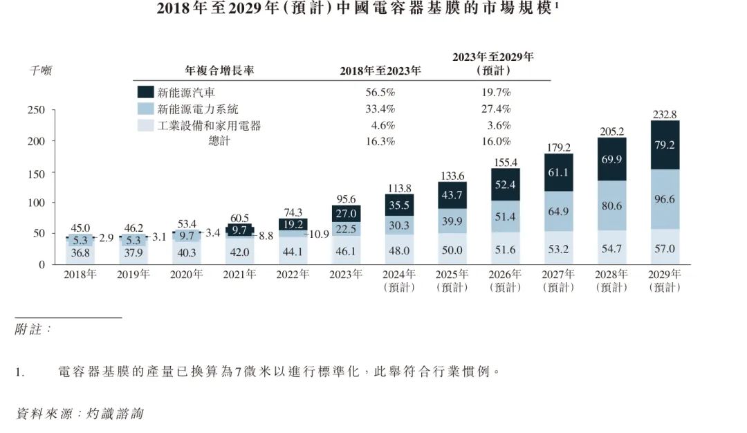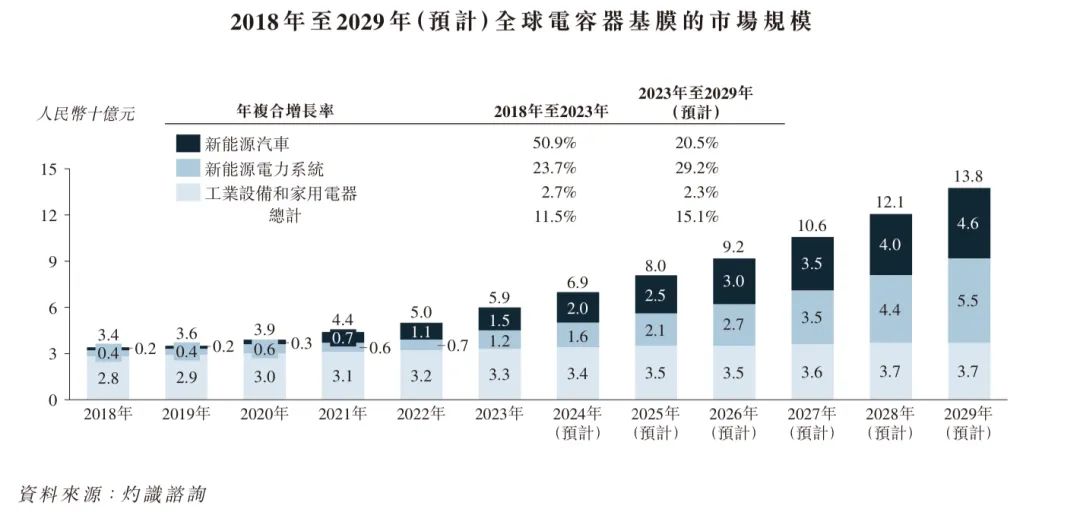 全球电容器基膜市场的规模由2018 年的人民币34 亿元增至2023 年的人民币59 亿元,年复合增长率为11.5%。这一增长是由新能源汽车及新能源电力系统等主要行业对薄膜电容器不断上升的需求所推动。电容器基膜在提升能量储存、电压调节及电力转换效率方面发挥着关键作用,这对于这些行业的发展至关重要。预计全球电容器基膜市场的规模将在2029 年达到人民币138亿元。