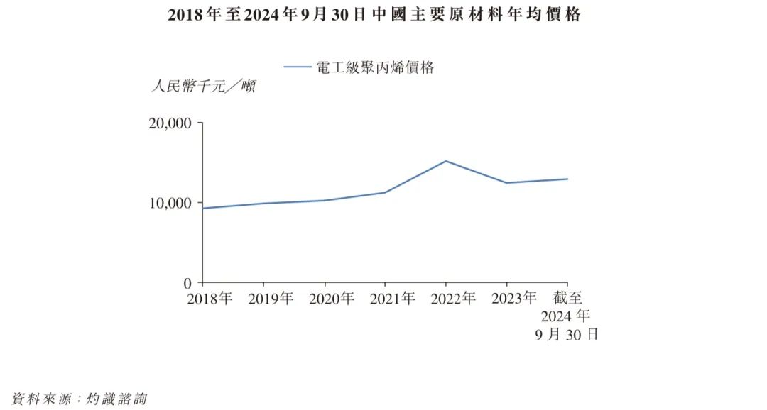 2018 年至2022 年,中国电容器基膜价格指数呈现上涨趋势,但2022 年后开始逐渐下降。此波动主要是由(i) 生产电工级聚丙烯的主要原材料原油的价格因俄乌冲突而波动,及(ii) 强劲的下游需求所推动,反映出电容器薄膜在各行各业中的应用日益广泛。