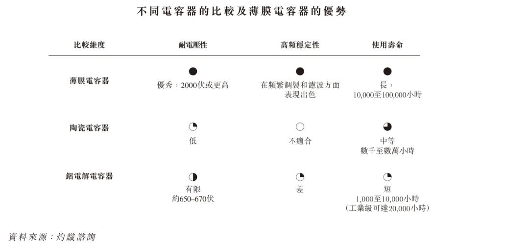 替代铝电解电容器:薄膜电容器正逐渐取代铝电解电容器,原因在于薄膜电容器具有卓越的耐电压性、更好的高频稳定性及更长的使用寿命。铝电解电容器的耐电压上限为650 至670 伏,而薄膜电容器可达到2000 伏或更高,这使得薄膜电容器更适用于高电压应用场景,尤其适用于新能源汽车和新能源电力系统。
