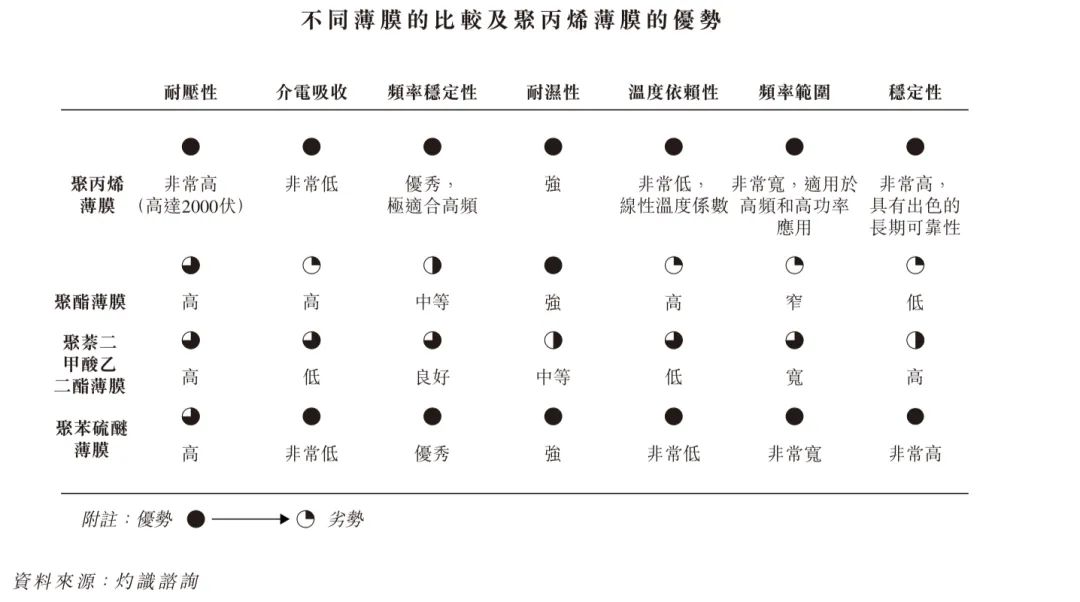 电容器薄膜主要可根据所使用的聚合物材料分为四种类型:聚丙烯(PP),聚酯(PET),聚萘二甲酸乙二酯(PEN) 以及聚苯硫醚(PPS),在各种薄膜材料中 神马影视,聚丙烯薄膜电容器因其卓越的频率稳定性,低介电吸收性以及高耐电压性脱颖而出,使其成为高频率及大功率应用的理想之选,目前,聚丙烯电容器薄膜是电容器薄膜类别中最主要的类型,占有超过90% 的市场份额。