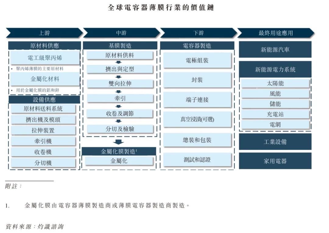 全球电容器薄膜行业的价值链包括上游原材料及设备供应、中游薄膜制造、下游薄膜加工及电容器制造,以及最终用途应用。